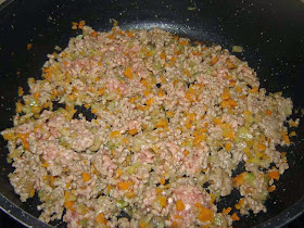 English. Let's start with the ragout, a sort of quick bolognaise. Put two tablespoons of oil in a casserole, then add finely chopped celery, onion and carrot (these veggies are the base for the "soffritto"). The secret to get a wonderful ragout is cooking vegetables slowly and enough time. Add a pinch of salt, so the veggies will release their liquid: if necessary add some spoon of water. They have to cook at least 15 minutes.