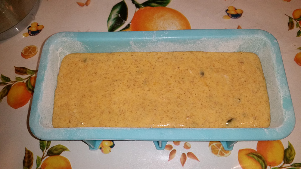 English. Grease with oil or butter the molds you chose: mini-plumcake or two big ones. Flour and throw away the exceeding flour. Divide the batter into each mold, bake to 180°C for about twenty minutes the small plumcake, at least 30/40 minutes the big one. When you see small cracks on the cakes surface, insert a toothpick inside a cake: if it comes dry you are sure that your plumcake is done.