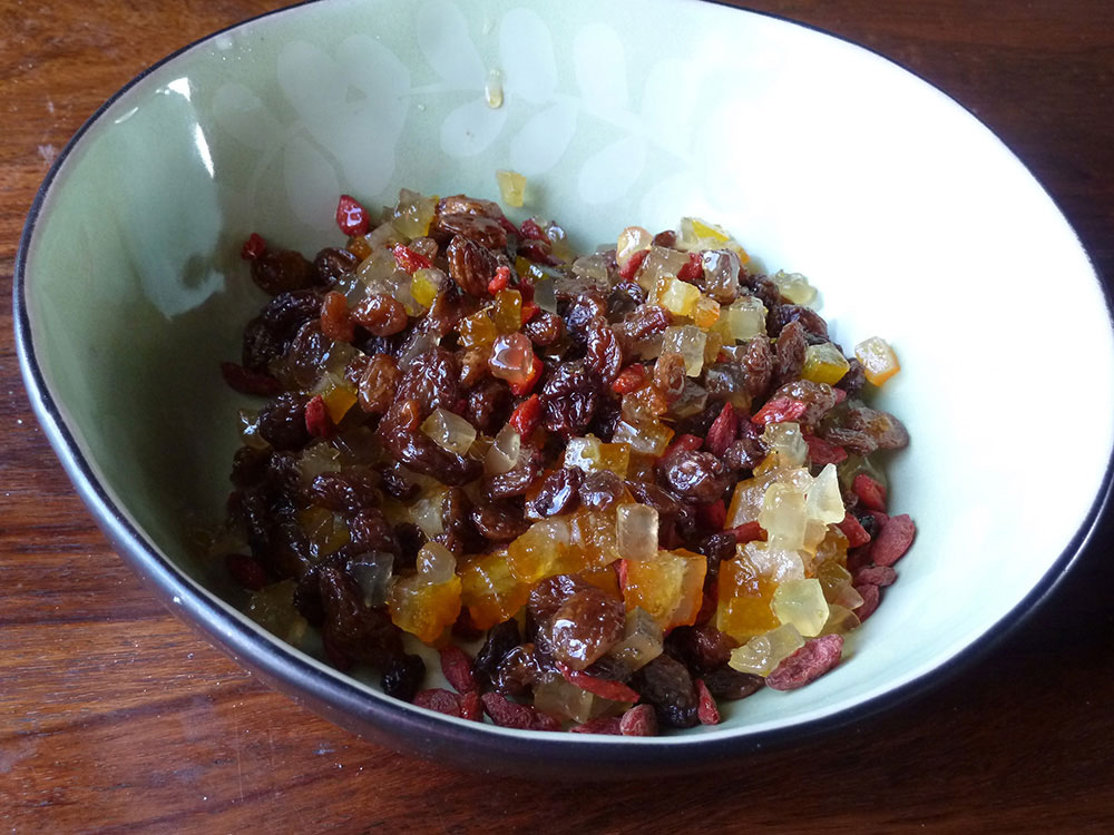 Italiano. Fate ammollare per una ventina di minuti in liquore (rum o liquore all’arancia, a vostro piacimento) l’uvetta e le bacche di goji. Tritate cedro e arancio canditi a cubetti.