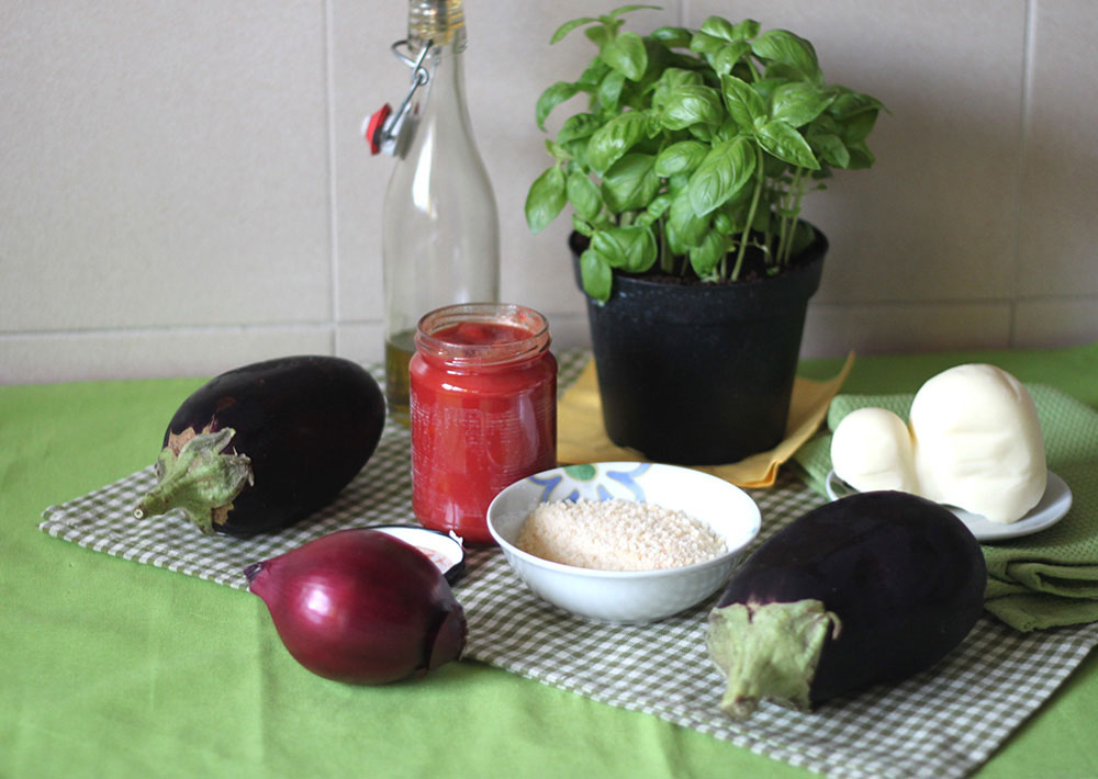 English. Take a large baking tray (or smaller, to make single portion, as we did). Place a layer of tomato sauce to the bottom. Line the eggplant slices to form a layer and cover them with tomato sauce, grated Parmigiano, hand-crumbled mozzarella cheese or provola. Keep on making layers of eggplants, sauce and cheese until you run out of vegetables.