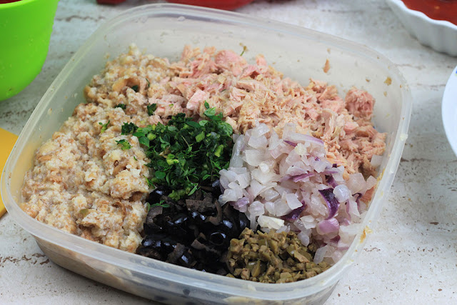 English. Wash the peppers, cut off the caps, remove cores and seeds. Pay attention not to cut the peppers, but if it would happen, do not worry: it is not a tragedy! Grab a bowl and place half of the cooked onion inside. Add canned tuna (drain off the oil), squeezed bread, chopped olives, capers and aromatic herbes. Add a pinch of salt (not too much: remember the capers are salted) and a pinch of freshly ground black pepper. Squeeze the half clove of garlic, add to the filling and combine well.