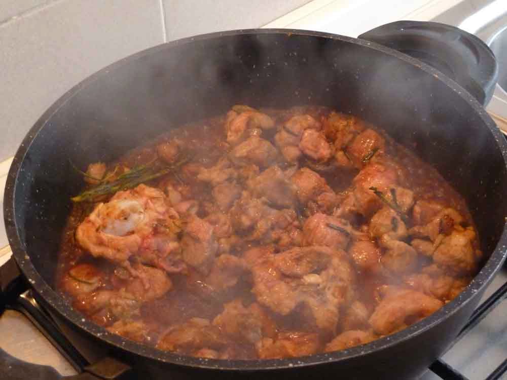 Quando l'alcool sarà evaporato, aggiungete un bicchiere d'acqua e lasciate cuocere lo stufato per 50 minuti circa a fuoco lento. Se durante la cottura noterete che l'agnello si asciuga troppo, unite altra acqua fino a completare la cottura.